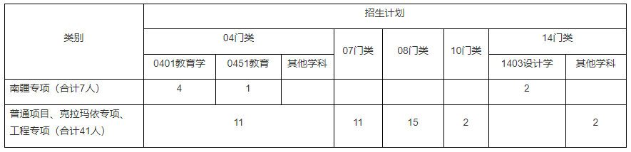 2.普通项目、克拉玛依专项招生学科为04门类、07门类、08门类、10门类、14门类(除1403设计学外)下所有学术学位、专业学位招生学科;工程专项招生学科仅限工程类专业学位(即招生学科代码前3位为085或086的学科);详见学校招生学科目录,并按照门类编制计划数,合计计划数41人(含工程专项2人、克拉玛依专项3人)。