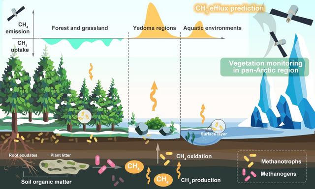 北极地区(北纬 60° 以北)作为全球土壤碳存储的关键区域,蕴藏着约占世界总量 50% 的土壤碳储备。然而近年来,这一区域正以全球平均升温速度四倍的速率急剧变暖,导致永久冻土大面积融化,不仅释放出冻土中封存的甲烷(CH4),更加速了土壤有机碳的微生物分解过程,进一步推高甲烷排放量。作为强效温室气体,甲烷的全球变暖潜能值约是二氧化碳30 倍,其排放量的增加正形成 "气候变暖-冻土融化-甲烷释放" 的恶性循环。目前对泛北极地区年净甲烷排放量的估算存在显著不确定性,这种不确定性严重影响了全球气候模型的准确性,也为制定有效的减排政策带来挑战。