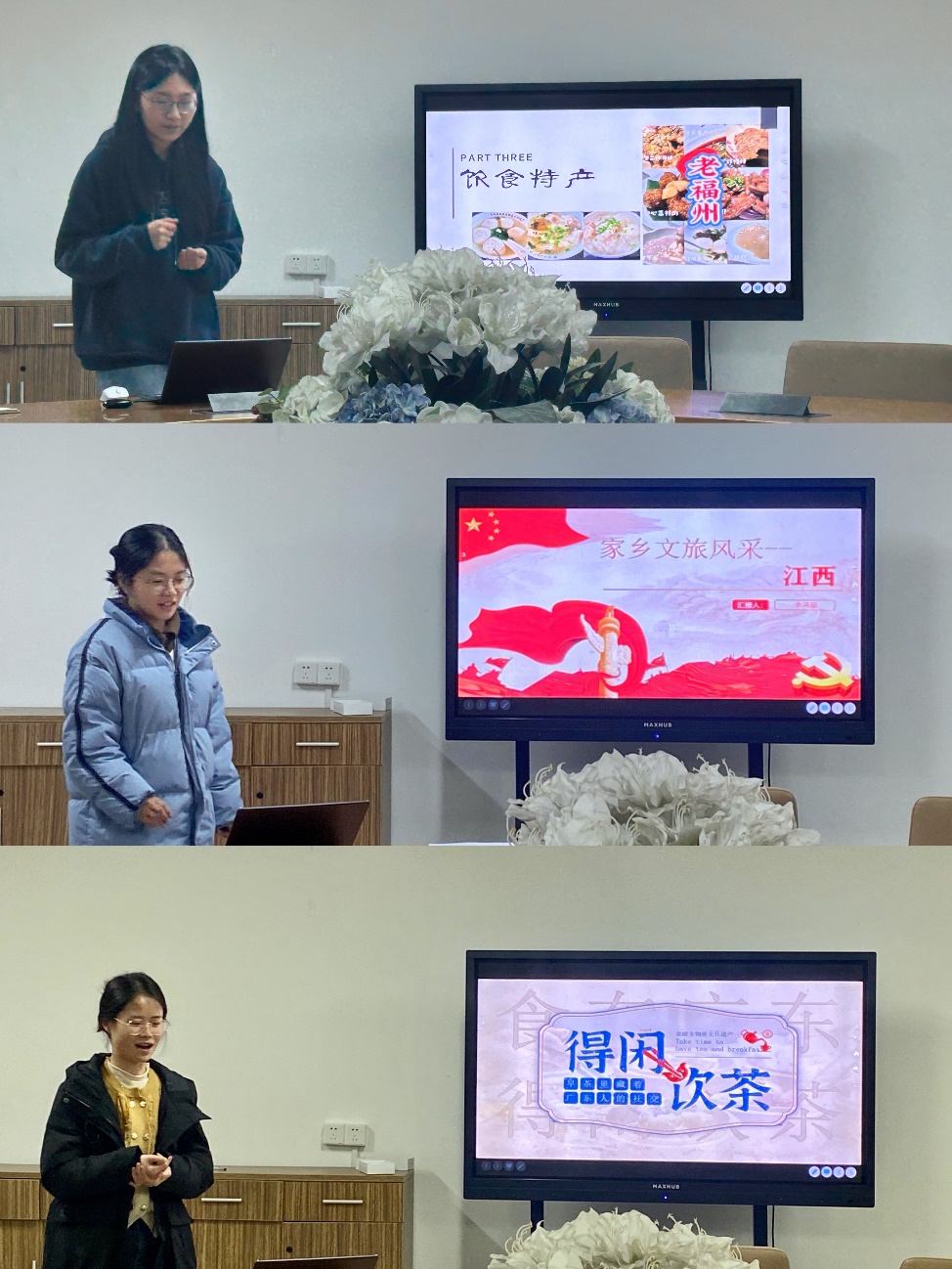 第三组是来自“云川贵渝”的赵悠朵、陈其睿和刘纹君。赵悠朵从“经济发展“出发,让我们感受到在新中国发展下的贵州翻天覆地的变化;陈其睿从“制定旅游攻略“的角度出发,向我们安利了云南各个旅游景点,让大家心之神往;刘纹君为大家带来了一堂重庆话的教学课堂,让大家对重庆方言有了新了解。