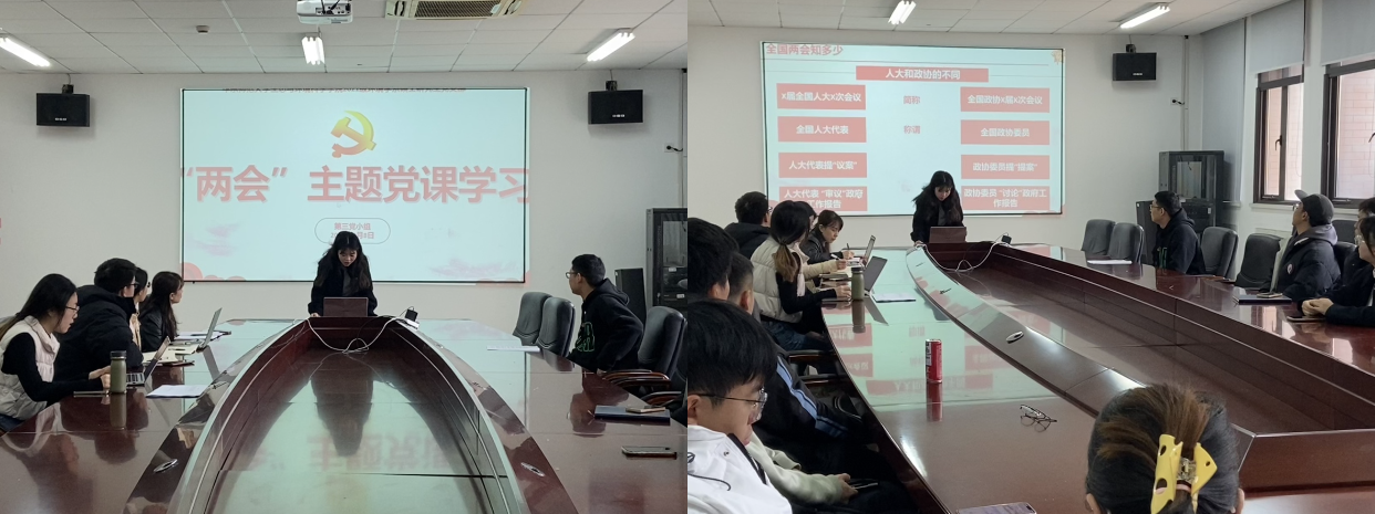 为了学习贯彻习近平总书记重要讲话精神和全国“两会”精神,深入领会党的路线、方针与政策,引导青年党员深刻领会、准确把握“两会”精神实质,2024年3月8日上午10:00,泥巴影院 2021级环境学硕士研究生党支部于闵行校区资环楼269室开展专题组织生活。本次活动由第五党小组主持,主要包括时政要闻分享和“两会”主题党课学习两个部分,支部指导老师吴丹和全体党员到场参会。