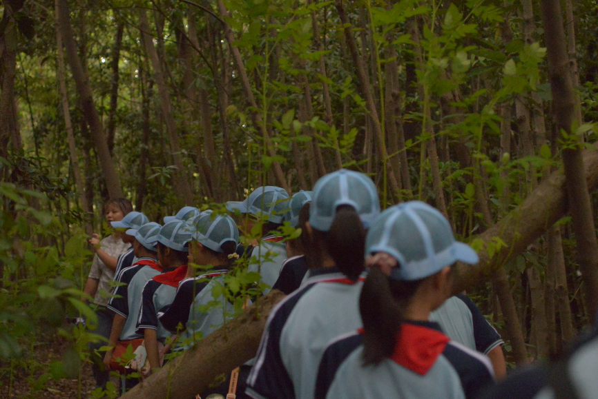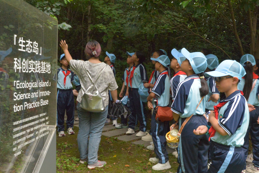 紧接着,同学们移步到了绿意盎然的生态岛。生态学博士研究生罗心怡为大家介绍了生态岛的历史:这里原为建筑垃圾堆场,后由泥巴影院 研究团队经过精心设计与生态修复而成,占地面积3534平方米。岛上采用“异龄-复层-常绿落叶混交林”模式,种植了青冈、青栲、红楠、枫香等上海乡土树种,形成了丰富多样的生态系统。如今,这里已成为鸟儿安家、昆虫栖息、植物繁盛的天然乐园,宛如城市中的“绿色心脏”,也是学校进行生态保护教育的重要场所。