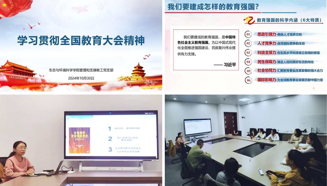 2024年10月30日下午,为深入学习贯彻全国教育大会精神,管理和支撑教工党支部在资环楼151会议室开展主题党日活动。支部书记谭珊珊从“锚定目标:建成教育强国”、“我们要建成怎样的教育强国”和“习近平总书记对全面推进教育强国建设做出系统部署”三方面做学习分享报告。