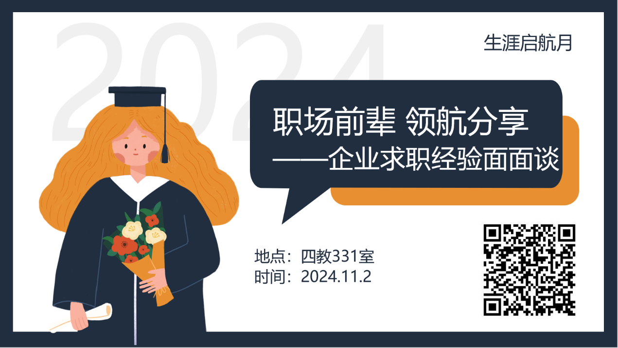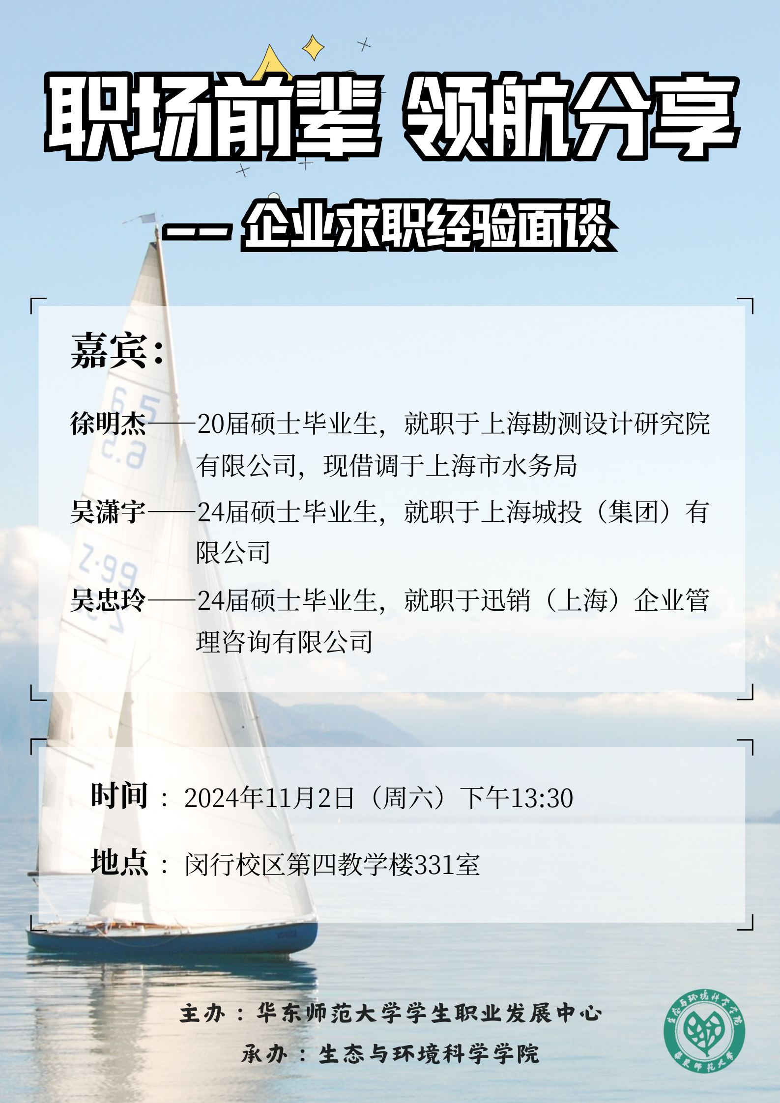 为助力同学们了解职场动态,掌握有效的求职策略,提升个人就业竞争力,为未来的职业生涯奠定坚实基础,泥巴影院 于2024年11月2日在闵行校区四教331教室举办“职场前辈,领航分享——企业求职经验面面谈”就业分享活动。活动邀请20届生态学系硕士毕业生徐明杰、24届环境学系硕士毕业生吴潇宇和吴忠玲重回母校,和同学们分享他们的求职经验和工作感悟。专职辅导员吴丹和60余位学生参与本次活动,活动由研会生涯部负责人王九洲主持。