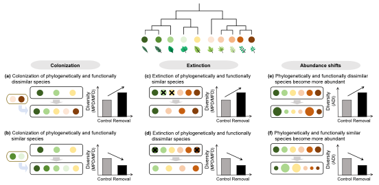 图1:本研究提出的概念框架,阐释了物种定殖、丧失及多度变化如何影响入侵物种移除后群落多样性的恢复过程